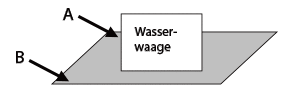 Ebenheit des Fußbodens | Legen Sie eine Bodenplatte auf den Fußboden, auf dem das Gerät aufgestellt werden soll, und stellen Sie eine Wasserwaage auf deren Mitte. Um die Bodenplatte waagerecht zu machen, fügen Sie einige Abstandshalter (Münzen) unter A oder B der Bodenplatte ein, wie in der folgenden Abbildung gezeigt. Berechnen Sie die Ebenheit des Fußbodens anhand der Dicke und der Anzahl der Abstandshalter. ![]() BerechnungsmethodeVerwenden Sie Münzen mit gleicher Dicke als Abstandshalter. Die Parameter sind wie folgt gegeben: t (mm): die Dicke des Abstandshalters a: die Anzahl der unter A eingesetzten Abstandshalter b: die Anzahl der unter B eingesetzten Abstandshalter Wenn a > b ist, wird die Ebenheit des Fußbodens nach der folgenden Formel berechnet. t x a (mm) BeispielAls Abstandshalter werden Münzen mit einer Dicke von 1 mm verwendet. Wenn zwei Abstandshalter unter A gelegt sind und nichts unter B gelegt ist, um die Bodenplatte horizontal einzustellen, beträgt die Ebenheit des Fußbodens 2 mm. | ||