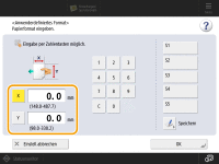Drücken Sie <X> oder <Y>, um die Länge der einzelnen Seiten mit den Zahlentasten einzugeben. ![]() Wenn Sie das häufig verwendete Papierformat auf den Schaltflächen <S1> bis <S5> registrieren, können Sie diese dann mit nur einem Tastendruck aufrufen. Registrieren von Papier in Sonderformat (anwenderdefiniertes Papierformat) | |