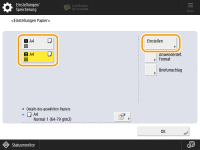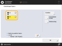 Papiertyp-VerwaltungseinstellungenWährend Sie den anwenderdefinierten Papiertyp für eine Papierzufuhr speichern, sind die Papiertypeinstellungen geschützt, und Sie können die Detailinformationen für den anwenderdefinierten Papiertyp nicht ändern und den anwenderdefinierten Papiertyp in <Einstellungen Verwaltung Papiertyp> in <Präferenzen> (Einstellungen/Speicherung) nicht löschen.