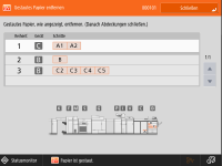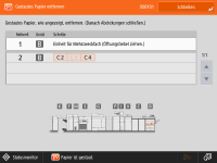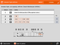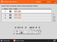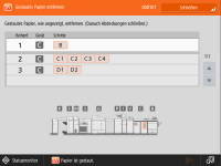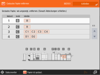 Die folgenden Tabellen zeigen die typischen Papierstaubildschirme und Papierstaupositionen (Bild) bei Verwendung von 1.300 mm langen Blättern sowie die Verweise auf die entsprechenden Verfahren. Die Papierstaupositionen können aufgrund solcher Gründe wie zum Beispiel der Papierlänge und des Zeitpunkts des Papierstaus leicht abweichen. |
