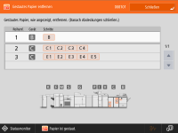 Möglicherweise befindet sich in der Position, die Sie prüfen, kein Papier. Befolgen Sie auch in diesem Fall die Anweisungen auf dem Bildschirm, um alle Positionen zu überprüfen. Der Bildschirm mit der Papierstaumeldung wird wiederholt angezeigt, bis Sie den Papierstau beseitigt haben. Wenn Sie <Schließen> auf dem Bildschirm mit der Papierstaumeldung drücken, können Sie möglicherweise mit den Vorgängen fortfahren und die Einstellungen festlegen, ohne den Papierstau sofort entfernen zu müssen. Entfernen Sie kein Papier an einer anderen Position, als der am Bildschirm als Papierstauposition angezeigten. Das kann einen Papierstau an anderen Positionen oder das Fehlen von Seiten in den Ausgabedokumenten verursachen. |