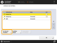 Wenn Sie einen Schlüssel und ein Zertifikat verwenden möchten, das Sie selbst generiert haben, müssen Sie den Schlüssel und das Zertifikat generieren, bevor Sie das nachfolgende Verfahren ausführen. Generieren der Schlüssel und Zertifikate für die Netzwerkkommunikation Wenn Sie einen Schlüssel und ein Zertifikat verwenden möchten, das Sie von einer Zertifizierungsstelle (CA) erwerben, müssen Sie den Schlüssel und das Zertifikat registrieren, bevor Sie das nachfolgende Verfahren ausführen. Registrieren eines Schlüssels und Zertifikats Wenn Sie <Verschlüsselungsmethode für FIPS 140 formatieren> auf <Ein> setzen, erfolgt die TLS-Kommunikationsverschlüsselungsmethode gemäß den von der Regierung der Vereinigten Staaten genehmigten FIPS (Federal Information Processing Standards) 140. <Verschlüsselungsmethode für FIPS 140 formatieren> Wenn <Verschlüsselungsmethode für FIPS 140 formatieren> auf <Ein> gesetzt wird, tritt ein Fehler auf, wenn Sie versuchen, ein Zertifikat für TLS festzulegen, das einen Algorithmus verwendet, der nicht von FIPS (geringer als RSA2048bit) erkannt wird. Es tritt ein Kommunikationsfehler auf, wenn Sie <Verschlüsselungsmethode für FIPS 140 formatieren> auf <Ein> setzen und an eine entfernte Teilnehmergruppe senden, die von FIPS anerkannte Verschlüsselungsalgorithmen nicht unterstützt. Wenn <Verschlüsselungsmethode für FIPS 140 formatieren> auf <Ein>, <CHACHA20- POLY1305> und <X25519> auf <Aus>. Wenn <CHACHA20- POLY1305> oder <X25519> auf <Ein>, <Verschlüsselungsmethode für FIPS 140 formatieren> auf <Aus>. |