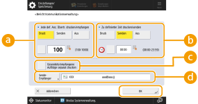 Bei Dokumenten, die per E-Mail gesendet wurden, gibt die Liste das Sendeergebnis zwischen dem Gerät und dem E-Mail-Server, nicht zwischen dem Gerät und dem Empfänger an. Sie können festlegen, ob die Liste automatisch gedruckt werden soll. |