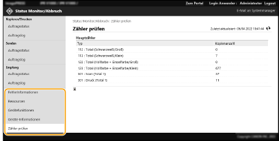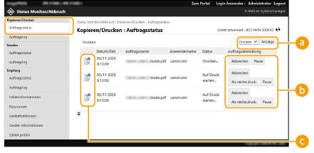 Sie können Remote UI zum Überprüfen des Status der Dokumente, die auf ihre Verarbeitung warten, sowie der Protokolle der Dokumente, die verarbeitet wurden, verwenden. Sie können auch den Status des Geräts wie beispielsweise Fehlerinformationen und verbleibende Menge der Verbrauchsmaterialien überprüfen.