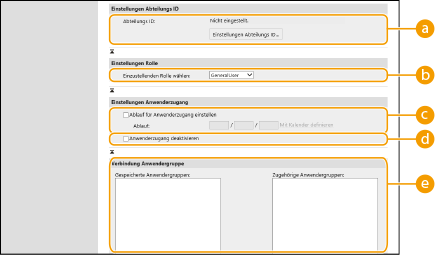 [Ablauf für Anwenderzugang einstellen]Aktivieren Sie das Kontrollkästchen, und geben Sie einen Wert für [Ablauf] ein, wenn Sie einen Gültigkeitszeitraum für das Konto festlegen.