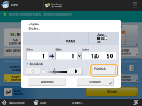 Sie können <Prüfdruck> nicht für die folgenden Aufträge wählen. Ein Auftrag, für den der Modus Gruppieren oder Versetzt Gruppieren eingestellt ist Ein Auftrag, der auf Kopieren wartet oder auf Pause gestellt ist Ein Auftrag, für den Kopieren momentan unterbrochen ist Ein Auftrag, der momentan Musterkopieren ausführt Ein Auftrag, der momentan Prüfdruck ausführt Wenn die verbleibende Kopie die letzte oder fast letzte ist, können Sie den Prüfdruck nicht durch Auswahl von <Alle Seiten> ausführen. Wenn es nur wenige Seiten in einer Kopie gibt, können Sie keinen Prüfdruck durch Auswahl von <1. Seite (zufällig)> durchführen. Die Ausgabe kann einige Zeit in Anspruch nehmen, auch wenn Sie <Prüfdruck> wählen. |