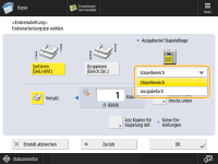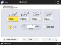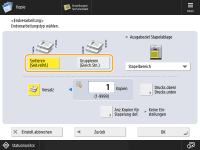 ![]() | Wenn Sie zwei oder mehr Kopien über die Zufuhr kopieren, können Sie die Sortierung oder Gruppierung für die Reihenfolge der Ausdrucke auswählen. Wählen Sie "Sortieren", um die Sätze mit aufeinanderfolgenden Seiten zu drucken. Wählen Sie "Gruppieren", um jede Seite gebündelt zu drucken (also 10 Blätter für die erste Seite, 10 Blätter für die zweite Seite usw.). |