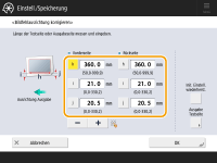 Kehren Sie zum Bildschirm <Bildfehlausrichtung korr.> zurück und geben Sie die gemessene Länge von <i> und <j> (bei Bannern: die gemessene Länge von <h>, <i> und <j>) für die Vorder- und Rückseite ein.Mithilfe der folgenden beiden Zahlenwerte und "h = 360,0" (bei Bannern: "h = 360,0/450,0/550,0/650,0" für [h], das der hinteren Kante des Papiers am nächsten ist) passt das Gerät seine Einstellungen so an, dass der Druckbereich und das Papier parallel werden.