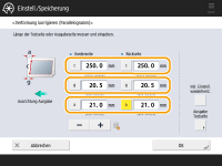 Kehren Sie zum Bildschirm <Verzerrung korrigieren (parallelförmig)> zurück und geben Sie die gemessene Länge von <g> und <a> für die Vorder- und Rückseite ein.Mit den folgenden zwei Zahlenwerten und "c = 250,0" passt das Gerät die Länge zum Korrigieren der Verzerrungen im Druckbereich an.