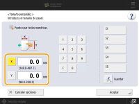 Pulse <X> o <Y> para introducir la longitud de cada cara mediante las teclas numéricas. ![]() Si registra el tamaño de papel que utiliza con más frecuencia en los botones <S1> a <S5>, puede recuperarlo con solo pulsar una vez. Registrar papel de tamaño libre (Tamaño de papel personalizado) | |
