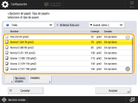 Si el tipo de papel del papel que ha cargado no aparece en la lista de la pantalla de ajustes indicada, puede registrarlo en la lista de tipos de papel.