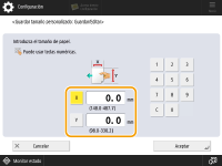 Puede registrar hasta cinco tamaños libres de papel de uso frecuente. Los tamaños de papel aquí registrados aparecen en la pantalla de selección del tamaño de papel para el casete y la bandeja multiuso (Especificar el tamaño y tipo de papel en el casete o Especificar el tamaño y el tipo de papel en la bandeja multiuso (Opcional)).