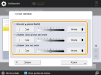 Si se configura hacia el lado <Oscura>, se incrementan las áreas impresas con la densidad máxima. Si se configura hacia el lado <Clara>, las áreas de relleno, el texto y las líneas podrían imprimirse como tonos medios donde faltan puntos. Esta opción debe utilizarse principalmente para ajustar las densidades intermedias.