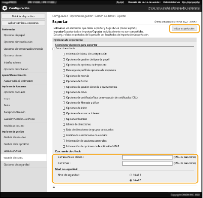 Escriba la contraseña en [Contraseña de cifrado] seleccione el nivel de seguridad en [Nivel de seguridad] haga clic en [Iniciar exportación]  [Bien].