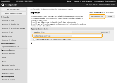 En [Contraseña de descifrado], introduzca la misma contraseña introducida al exportar los datos de configuración.