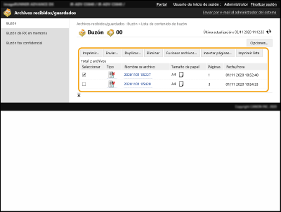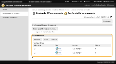 ![]() | Puede utilizar la IU remota para imprimir, enviar o eliminar archivos almacenados en el Buzón de correo o I-faxes que se han almacenado temporalmente en la Bandeja de entrada de I-fax. |