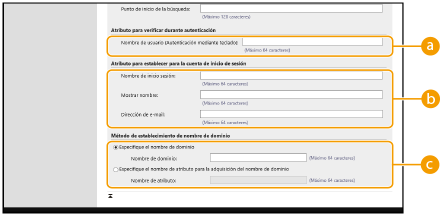 4 | Especifique cómo configurar los nombres de atributos y el nombre de dominio. ![]() [Nombre de usuario (Autenticación mediante teclado):]Especifique el campo de datos LDAP (nombre de atributo) del nombre de usuario en el servidor LDAP (Ejemplo: uid). [Nombre de inicio sesión:] / [Mostrar nombre] / [Dirección de e-mail]Especifique los campos de datos (nombres de atributo) del nombre de inicio de sesión, el nombre visualizado y la dirección de correo electrónico de cada cuenta de usuario en el servidor LDAP (Ejemplo: uid, cn, mail). [Especifique el nombre de dominio] / [Especifique el nombre de atributo para la adquisición del nombre de dominio]Seleccione cómo configurar el nombre de dominio del destino de inicio de sesión. Para especificar el nombre de dominio directamente, seleccione [Especifique el nombre de dominio] e introduzca el nombre de dominio. Para especificar un campo de datos LDAP (nombre de atributos) desde el que adquirir el nombre de dominio en el servidor LDAP, seleccione [Especifique el nombre de atributo para la adquisición del nombre de dominio] e introduzca el nombre de atributo (Ejemplo: dc). |