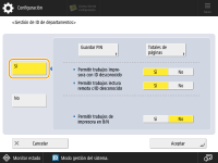 3 | Introduzca el ID de departamento y el PIN, y pulse <Aceptar>. ![]() <ID dpto.>Introduzca un número de 7 dígitos o menos para el ID de departamento. <PIN>Introduzca un número de un máximo de 7 dígitos para el PIN y pulse <Confirmar>. Vuelva a introducir el PIN a modo de confirmación y pulse <Aceptar>. Si no desea establecer un PIN, deje este elemento en blanco. ![]() No podrá registrar un ID de departamento o un PIN que contenga únicamente ceros, como por ejemplo "00" o "0000000". Aunque se introduzcan menos de siete dígitos, se añaden ceros al inicio del número y se configura un número de siete dígitos. Puede pulsar <Activar/des. límite y fijar límite páginas> para configurar el número total de páginas que puede el departamento puede copiar, escanear e imprimir. También puede establecer como requisito la introducción de siete dígitos para los ID de departamento y para los PIN. Para obtener más información, póngase en contacto con su distribuidor o representante del servicio técnico. Si se alcanza cualquiera de los límites de páginas en color o blanco y negro mientras se imprime un documento con zonas tanto en color como en blanco y negro, el equipo se detendrá. Si se alcanza cualquiera de los límites de impresiones o copias totales en color o blanco y negro mientras se copia un documento con zonas tanto en color como en blanco y negro, el equipo se detendrá. |
