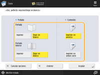 2 | Seleccione las opciones de copia en <Guarda delantera> y <Guarda trasera> pulse <Aceptar>.Pulse <Dejar en blanco> si no quiere copiar en la hoja de guarda. Si alimenta papel para la hoja de guarda desde la "Unidad de Inserción R", seleccione <Dejar en blanco>. Para establecer el papel para la hoja de guarda, pulse <Cambiar> para <Selección de papel> seleccione el origen del papel pulse <Aceptar>. |
