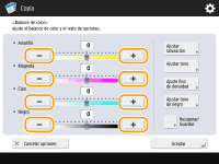 <Ajuste fino de densidad>Seleccione un color y ajuste su nivel de densidad por su área de densidad con el botón <-> o <+>. Cuando termine el ajuste, pulse <Aceptar>.