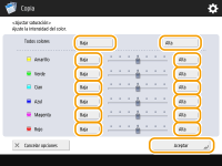 para <Todos los colores>. Para establecer cada color por separado, utilice los botones que están a la izquierda y a la derecha de cada color. Cuando termine el ajuste, pulse <Aceptar>.