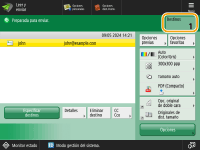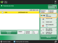 Comprobar el número total de destinos especificadosEn la parte superior derecha de la pantalla se muestra el número total de destinos especificados. Esto le permite confirmar antes de proceder al envío que el número de destinos es correcto. Para cancelar inmediatamente un trabajo que se está enviandoSi pulsa  (Detener) en el panel de control mientras se está enviando un trabajo, aparecerá el mensaje <¿Desea cancelar el siguiente trabajo de envío?>. Pulse <Sí> para cancelar el envío. Pulse  (Detener) cuando haya varios trabajos de envío que mostrar en la pantalla para seleccionar el trabajo de envío que desea cancelar. Si no se muestra el trabajo de envío que desea cancelar, pulse <Compruebe otros trab.> para mostrar <Trabajos de envío>. Seleccione el trabajo que desea cancelar y pulse <Cancelar>. Para consultar los estados de los documentos enviados/guardadosCuando <Mostrar notificación cuando se acepta el trabajo> está establecido en <Sí>, la pantalla <Monitor estado> puede mostrarse desde la siguiente pantalla mostrada tras la recepción de un trabajo enviado. <Mostrar notificación cuando se acepta el trabajo>Para imprimir el informe de los resultados del envío/guardadoEn la pantalla de Funciones básicas de lectura, al pulsar <Opciones>  <Informe de TX> puede configurar que se imprima automáticamente el informe con la lista de resultados del envío/guardado. Para establecer esto para cada trabajo en <Opciones>, es necesario seleccionar <Sólo en caso de error> o <No> en <Informe de TX> y, a continuación, configurar <Permitir impresión desde opciones> en <Sí>. Nombre de archivoCuando se envía/guarda un archivo, el nombre de archivo se establece automáticamente según el formato siguiente. Puede cambiar la configuración para poder asignar un nombre. Configurar un nombre de archivoAl enviar por correo electrónico "Números de trabajo (cuatro dígitos)_números de página (tres dígitos).nombre de extensión de archivo", como "1042_001.jpg" Al guardar en un servidor de archivos "El año, mes, día, hora, minuto y segundo en que se guarda el archivo (14 dígitos).nombre de extensión de archivo", como "20151030133541.jpg" Asunto del correo electrónicoDetectar alim. varias hojas Detectar alim. varias hojas Cuando se introducen múltiples hojasSe detendrá el escaneado y aparecerá el mensaje en pantalla. Siga las instrucciones para eliminar el atasco. Cuando haya eliminado el atasco, aparecerá la pantalla de reanudación de trabajo. Si el equipo detecta erróneamente alimentación múltiple de hojas, pulse <No detectar alimentación de varias hojas> para reanudar el escaneado. Para configurar de antemano que el equipo no le notifique alimentación múltiple de hojas, realice una de las siguientes operaciones. Cada vez que envíe/guarde un documento, pulse <Opciones> en la pantalla Funciones básicas de lectura  seleccione <Detectar alim. varias hojas> para deshabilitar el ajuste. |