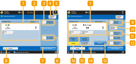 | <Muestra impres.> aparece solo si establece la realización de varias impresiones y uno de los siguientes ajustes al mismo tiempo. Tenga en cuenta que las funciones disponibles pueden variar en función del modelo y de las opciones instaladas. <Clasificar (por juegos)> <Desplazar> <Grapar + Clasificar> <Cuadernillo> <Portada> <Insertar hojas> <Fusionar archivos e imprimir> cuando se seleccionan varios archivos |