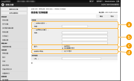 可以在触摸面板显示屏幕上向用户显示信息。信息可以显示在触摸面板显示屏幕的底部,也可以显示在单独的弹出式窗口中,并且可以根据信息或用户的类型选择要使用的显示方法。在弹出式窗口中显示信息时,还可以显示与“远程用户界面”门户页面上相同的信息。配置这些设置需要“管理员”权限。