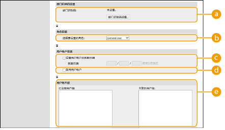 [用户组关联]要将用户指定到某个组时,从列表中选择一个已注册的用户组并单击[添加]。将“部门识别码”用作用户组时,不显示此设置。