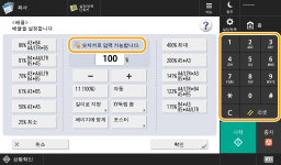 숫자 키를 표시할 때< 숫자키로 입력 가능합니다.>가 표시되면 숫자 키를 사용하여 숫자 값을 입력할 수 있습니다.예: <배율> 설정 화면 ![]() < 숫자키로 입력해 주십시오.>가 표시되면 숫자를 입력하는 데 숫자 키만 사용할 수 있습니다.USB 키보드에서 문자를 입력합니다.문자를 입력하려면 USB 포트에 연결하여 USB 키보드를 사용할 수도 있습니다(앞면). USB 키보드에서 입력할 때 다음 사항에 유의합니다. <USB 설정>의 <USB 입력 디바이스에 MEAP 드라이버 사용>을 <해제>로 설정합니다. <USB 입력 디바이스에 MEAP 드라이버 사용> USB 키보드에서 ASCII 문자만 입력할 수 있습니다. Delete, End, Tab, Esc 및 기능 키와 같은 터치 패널 디스플레이의 키보드 화면에 표시되지 않는 키들은 USB 키보드에서 사용할 수 없습니다. USB 키보드의 입력음은 소리 설정 화면의 <입력음> 및 <입력 무효음> 설정에 따른 것입니다.소리 설정 |