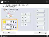 <X> 또는 <Y>를 눌러서 숫자 키를 사용하여 양쪽의 길이를 입력합니다. ![]() 자주 사용하는 용지 크기를 <S1>부터 <S5>까지 버튼에 등록하면 원터치로 불러낼 수 있습니다. 프리 사이즈 용지 등록(사용자 정의 크기 용지) | |