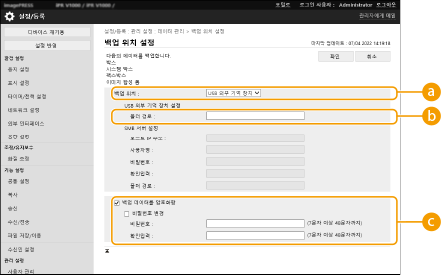 백업한 데이터를 변경하거나 삭제하지 마십시오. 데이터의 정상적인 복원이 불가능 할 수 있습니다. 조작 패널 또는 리모트 UI를 통해 기기를 작동 중일 때에는 백업을 실행하지 마십시오. |