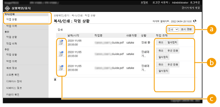 전송 대기중인 팩스 및 이메일, 수신된 I-팩스, 전송 대기중인 I-팩스의 상태를 확인할 수 있습니다. 문서 전송 및 수신 작업의 취소도 가능합니다.