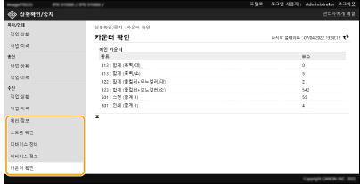 에러 정보, 용지 및 토너 잔량, 설치된 옵션 장치 정보 및 현재까지 인쇄된 총 페이지 수 등 기기에 대한 다양한 정보를 확인할 수 있습니다.