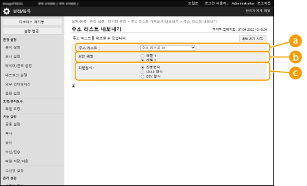 3 | 필요한 설정을 구성합니다. ![]() [주소 리스트]내보낼 주소 목록을 선택합니다. 단, 주소 목록이 저장된 후에는 주소 목록의 이름이 초기 설정으로 되돌아갑니다. [보안 레벨][파일형식]에서 [전용형식]이 선택된 경우, 보안 수준을 설정할 수 있습니다. [레벨 1]이 선택되면 모든 Canon 다기능 프린터로의 가져오기가 가능합니다. [레벨 2]를 선택하면, 주소 목록 데이터의 비밀번호가 [레벨 1]보다 높은 보안 방식을 사용하여 암호화 됩니다. 하지만, [레벨 2] 설정([보안 레벨]설정이 표시되는 모델)을 지원하는 기기로만 데이터를 가져올 수 있습니다. [파일형식]내보내기 할 파일의 데이터 형식을 선택합니다. 다른 Canon 다기능 프린터에 주소록에 등록된 모든 정보를 가져오기 하려면 [전용형식]을 선택하고, 해당 파일을 컴퓨터 응용 프로그램에서 사용하려면 [LDAP 형식] 또는 [CSV 형식]을 선택합니다. 단, [LDAP 형식]이 선택된 경우 이메일 주소만 저장할 수 있습니다. ![]() 내보낸 데이터에 비밀번호를 설정하려면 <주소록 내보내기 대상에 비밀번호를 포함>을 <설정>으로 설정합니다(<주소록 내보내기 대상에 비밀번호를 포함>). 이 설정이 구성되면 [주소 리스트 내보내기]화면에 비밀번호 입력 항목이 표시됩니다. 비밀번호가 설정되면, 올바른 비밀번호를 입력한 경우에만 데이터를 가져오기할 수 있습니다. CSV 형식으로 내보낸 데이터를 편집하려면 주소록의 각 열에 대한 내용은 주소록 항목을(를) 참조하십시오. 기기의 이전 버전으로 가져오면 데이터를 제대로 가져올 수 없습니다. |