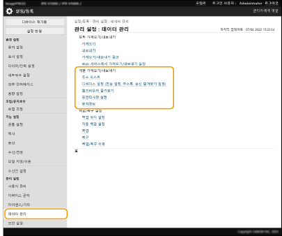 1 | [개별 가져오기/내보내기]에서 [디바이스 설정 (전송 설정, 주소록, 송신 즐겨찾기 설정)]을 클릭합니다. |