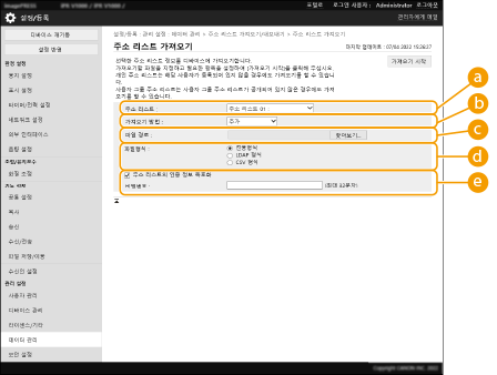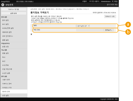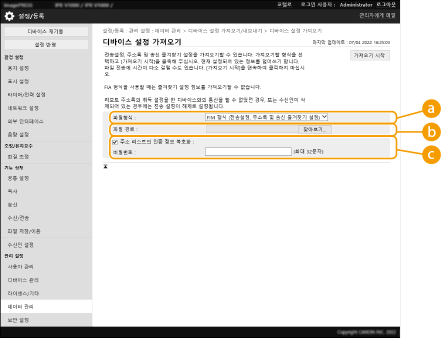 3 | 필요한 설정을 구성합니다. ![]() 현재 주소록이 삭제되고 가져오기 한 주소록 정보로 덮어쓰기 됩니다. 가져오기 중에는 기기가 재시작되기 전까지 리모트 UI에서 작업을 실행할 수 없습니다. 또한, 가져온 설정은 기기가 재시작된 이후에 적용됩니다.기기 종료/재시작 하기 ![]() [파일형식]가져오기 할 파일의 데이터 형식을 선택합니다. 데이터를 내보낸 다기능 프린터의 모델에 따라 파일 형식은 달라질 수 있습니다. 가져올 파일을 확인합니다. [파일 경로][찾아보기...]을 클릭하고 가져오기할 파일을 지정합니다. [주소 리스트의 인증 정보 복호화]암호화된 파일을 가져오기 하는 경우, 확인란을 선택하고 설정 데이터를 내보낼 때 입력한 것과 동일한 비밀번호를 입력합니다. |