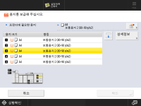 용지 크기가 길이 182mm에서 487.7mm 사이, 너비 139.7mm에서 330.2mm 사이인 경우에는 사용자 정의 크기 용지를 넣을 수 있습니다. 한쪽 크기가 넣을 수 있는 용지의 크기보다 크거나 작은 경우에는 사용자 정의 크기 용지를 넣을 수 없습니다. 인쇄 중에 용지를 적재하라는 메시지가 나타나는 경우, 적절한 용지를 적재한 후에 잔여 인쇄가 자동으로 수행됩니다. 다른 용지 공급원을 선택한 경우, <확인>를 누른 후 나머지가 인쇄됩니다. 인쇄를 취소하려면 <취소>을 누릅니다. 용지를 보통 용지에서 코팅지로 변경하여 "Multi-drawer Paper Deck-E"에 적재하는 경우, 용지에 따뜻한 바람을 불어넣기 위해 온도 조절이 필요하므로 이에 따른 대기 시간이 발생할 수 있습니다. 특수 매체 취급 가이드를 확인하여 "Multi-drawer Paper Deck-E"에 적재할 용지에 맞는 적절한 설정을 합니다. |