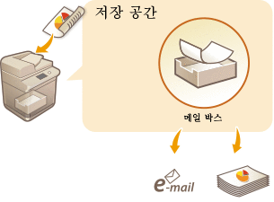 문서를 스캔하여 임시 저장 공간인 "메일함"에 저장하면 파일 합치기 및 파일의 페이지 삭제 등 간단한 파일 편집을 할 수 있습니다. 메일함은 특별한 설정 없이 사용할 수 있으므로 빠르고 간편하게 이용할 수 있습니다. 파일이 편집되고 나면, 인쇄나 이메일을 통해 컴퓨터로 파일을 전송하는 작업 등 용도에 따라 파일을 처리할 수 있습니다.