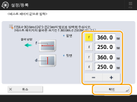 <f>: | 테스트 페이지 위의 'f' 마크 측정 길이를 입력합니다. 긴 시트의 경우: 긴 시트 테스트 페이지에서 측정된 'f' 마크 길이로부터 계산된 입력값을 입력합니다. 입력값 = ((기본 'f' 값: 360mm)/측정된 'f' 위치: 450, 550, 650mm)) x 측정된 'f' 값 |
