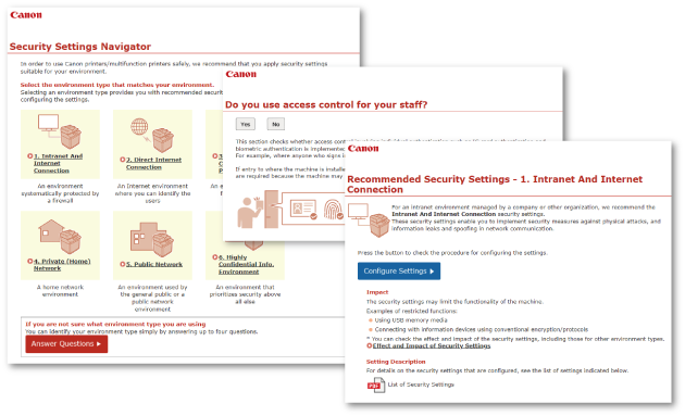 Viewing Security Settings NavigatorYou can find Security Settings Navigator on the manual page for your machine on the manual portal site. The security settings and the steps for configuring them described in Security Settings Navigator differ according to the model of your machine. Also note that Security Settings Navigator does not support some models. |