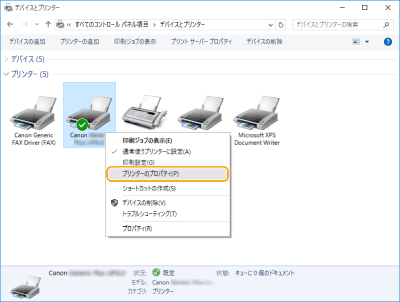 本機のアイコンを右クリックし、[プリンターのプロパティ]をクリックする