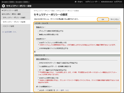 情報セキュリティーに関わる本機の設定を一括して適用/管理することができます。セキュリティーポリシーを管理する情報セキュリティーの担当者は、組織の方針に従って本機にセキュリティーポリシーを適用してください。セキュリティーポリシーを設定するには、Administratorの権限でリモートUIにログインしてください。