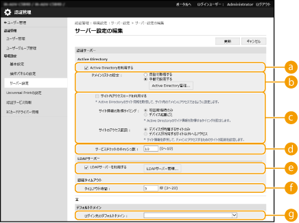 複数のActive Directoryサーバーがある場合、本機が所属するサイト内のActive Directoryに優先してアクセスするときは、チェックマークを付けます。必要に応じて[サイト情報の取得タイミング :]と[サイトのアクセス範囲 :]を変更してください。