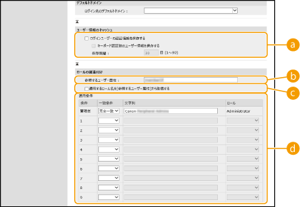 [参照するユーザー属性 :]で指定したサーバー上のデータフィールドに登録されている文字列をそのままロール名として使用します。あらかじめ本機で選択可能なロール名を確認し、サーバー側で登録しておいてください。