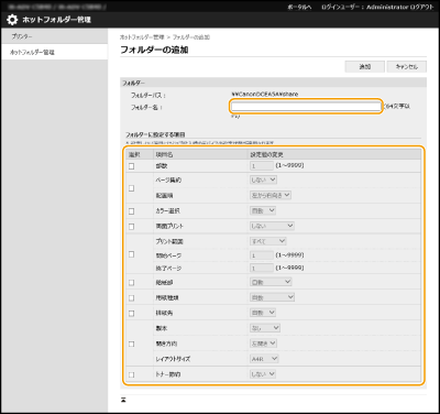 同じフォルダー名で複数登録することはできません。 共有フォルダ―に存在しているフォルダーと、同じ名称のフォルダー名を登録することはできません。 ホットフォルダーは、最大20個まで登録できます。 |