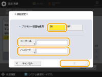 プロキシーサーバーの認証機能を使用するときに押して認証情報を設定します。表示される画面で<ON>を押し、プロキシー認証で使用するユーザー名とパスワードを入力したあと、<OK>を押します。