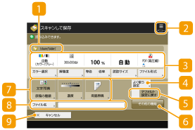ホームの<スキャンして保存>を押したあと、<ボックス>、<アドバンスドボックス>、<ネットワーク>、<メモリーメディア>のいずれかを押して原稿を読み込もうとすると、次の設定画面が表示されます。