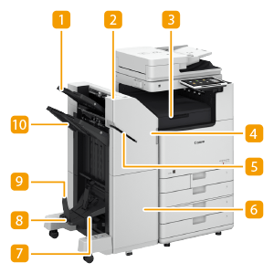Open to remove jammed paper, clear a staple jam in the stapler unit and saddle stitcher unit, or replace the staple cartridge. If the "2/3 Hole Puncher Unit-A" or "2/4 Hole Puncher Unit-A" (for the 230 V machine only) is installed, open to discard punch waste.