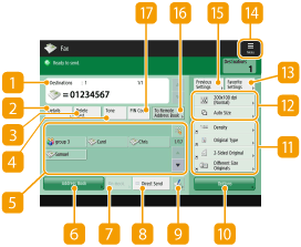 Some functions cannot be used in combination with each other. Buttons that cannot be selected are displayed in light gray. The total number of specified destinations is displayed on the top right of the screen. |